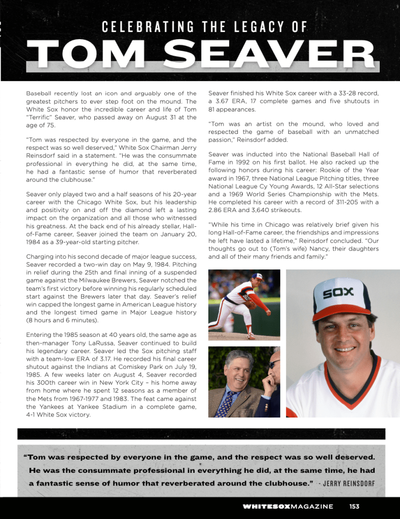 “Baseball recently lost an icon and arguably one of the greatest pitchers to ever step foot on the mound. The White Sox honor the incredible career and life of Tom ‘Terrific’ Seaver, who passed away on August 31 at the age of 75.“