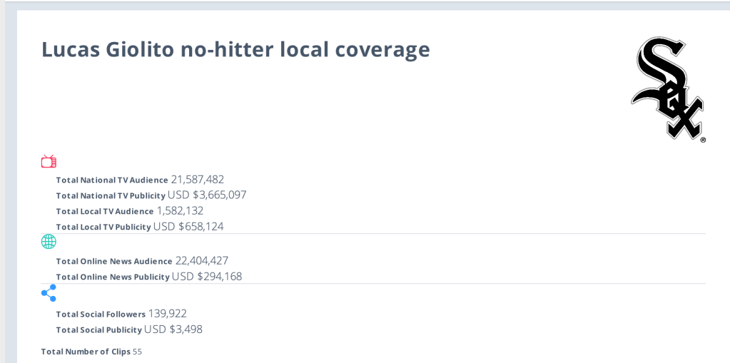 Critical Mention report for White Sox pitcher Lucas Giolito’s no-hitter coverage in the Chicagoland area.
